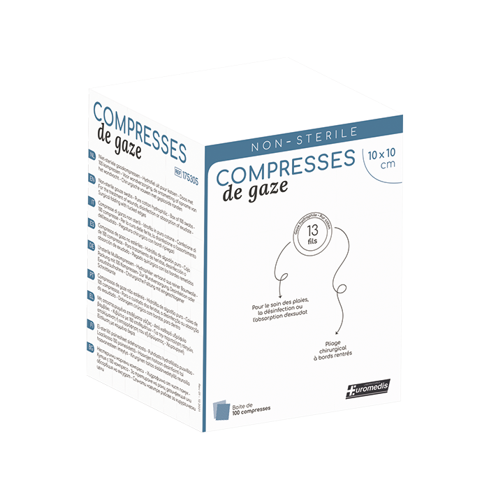 Compresse de gaze non-stérile 13 fils. 100% coton. Le grammage est de 17g/m².