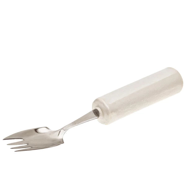 Cette fourchette profonde Queens est un couvert ergonomique pour personne handicapée ou âgée. Elle a été étudiée pour pouvoir être utilisée pour manger d'une seule main. Ses bords sont conçus pour couper la nourriture, sa fourche pour les saisir et son corps profond et arrondi peut servir de cuillère.