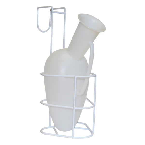 Ce porte urinal de la marque Comed s’accroche au bord du lit du patient, et permet de suspendre les urinaux pour femmes comme pour hommes. Il est constitué de fils d’acier recouverts de polyéthylène blanc, et garanti sans latex