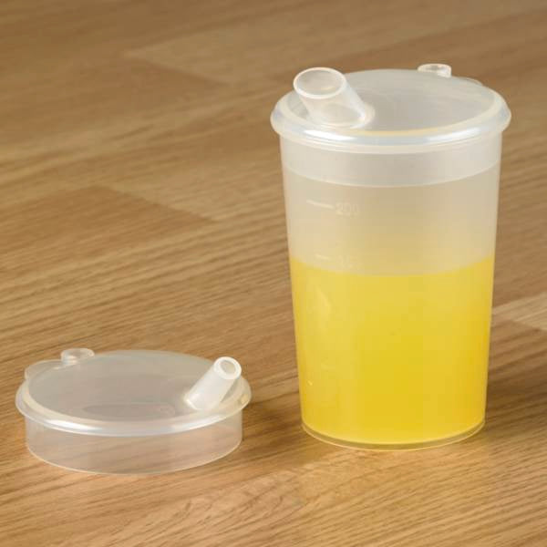 Gobelet en plastique transparent. Prise en main facile. Equipé d'un couvercle avec bec verseur et prise d'air.